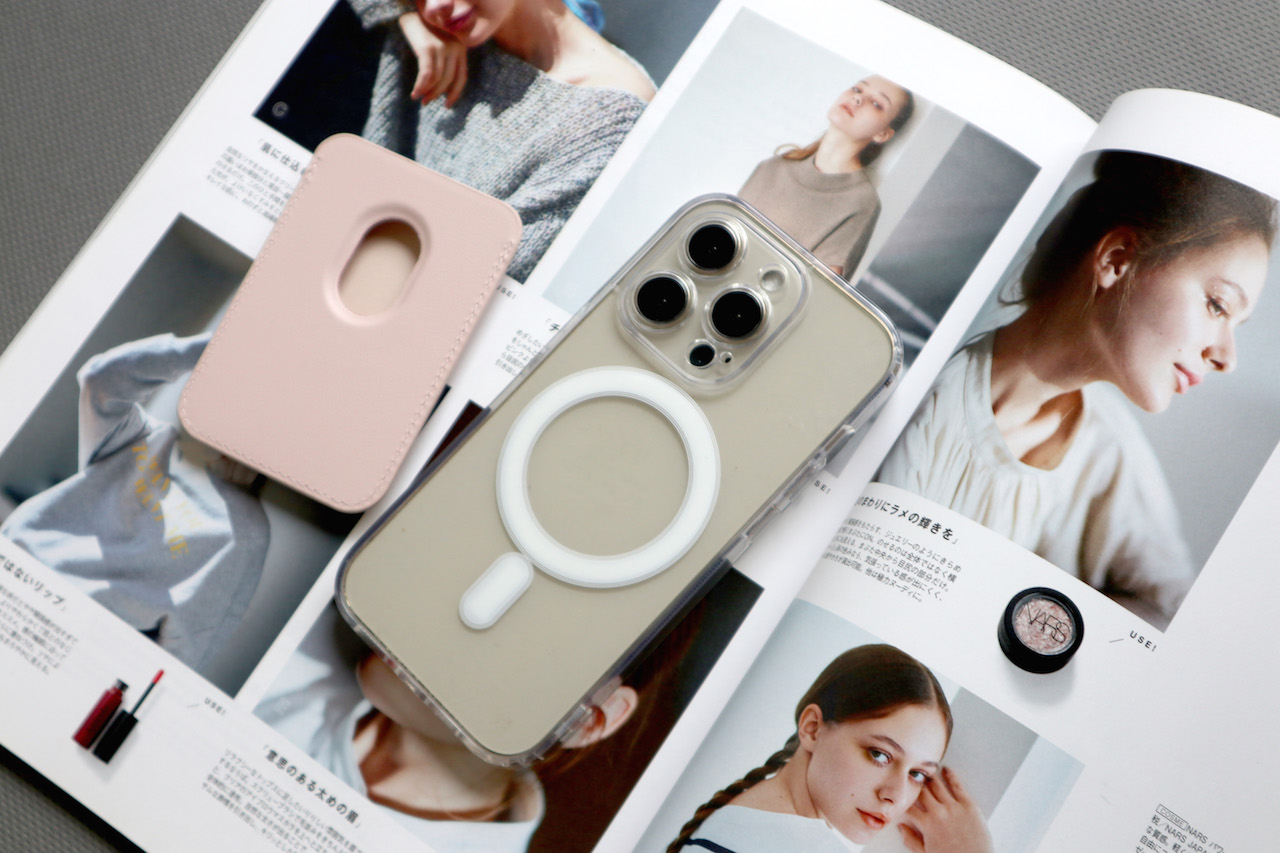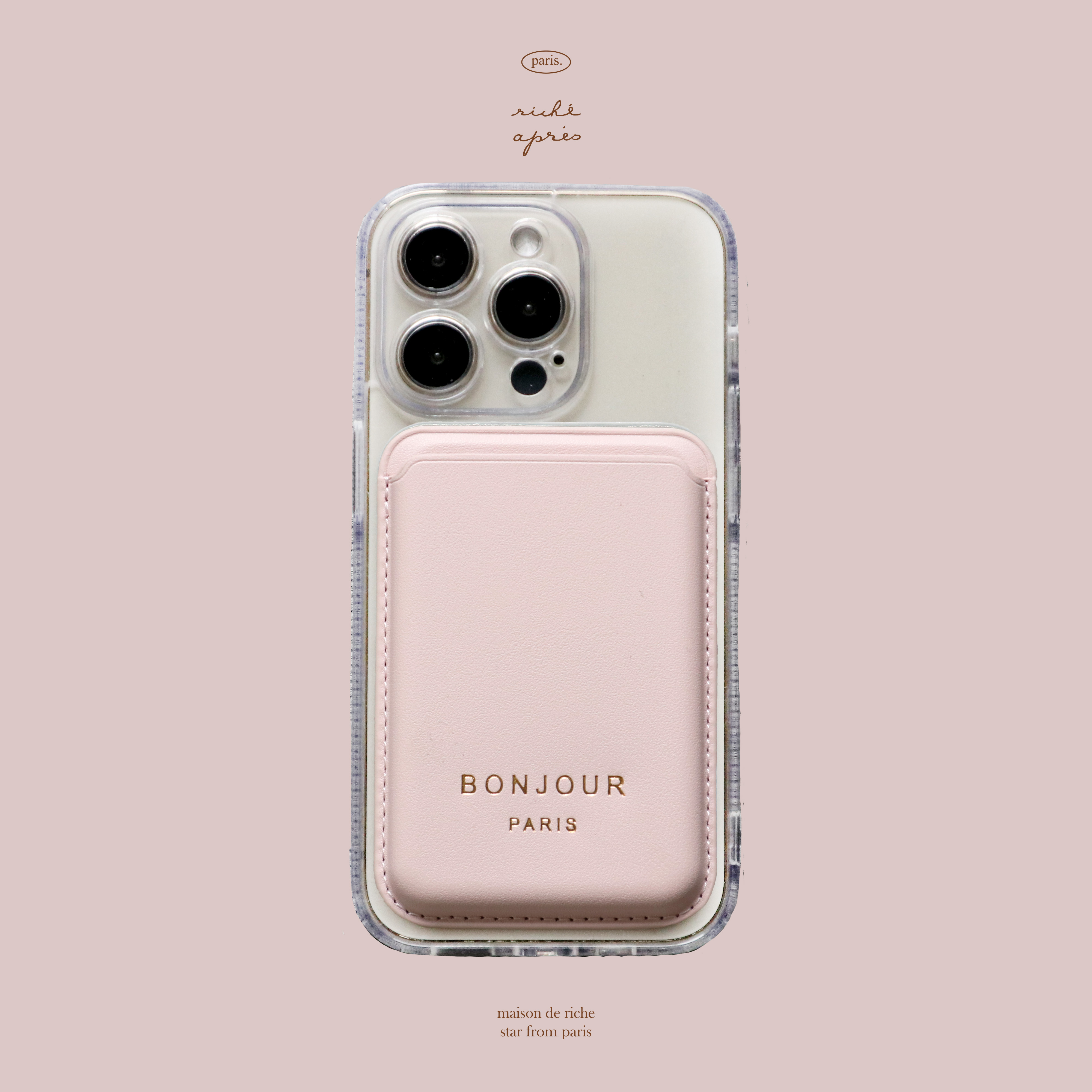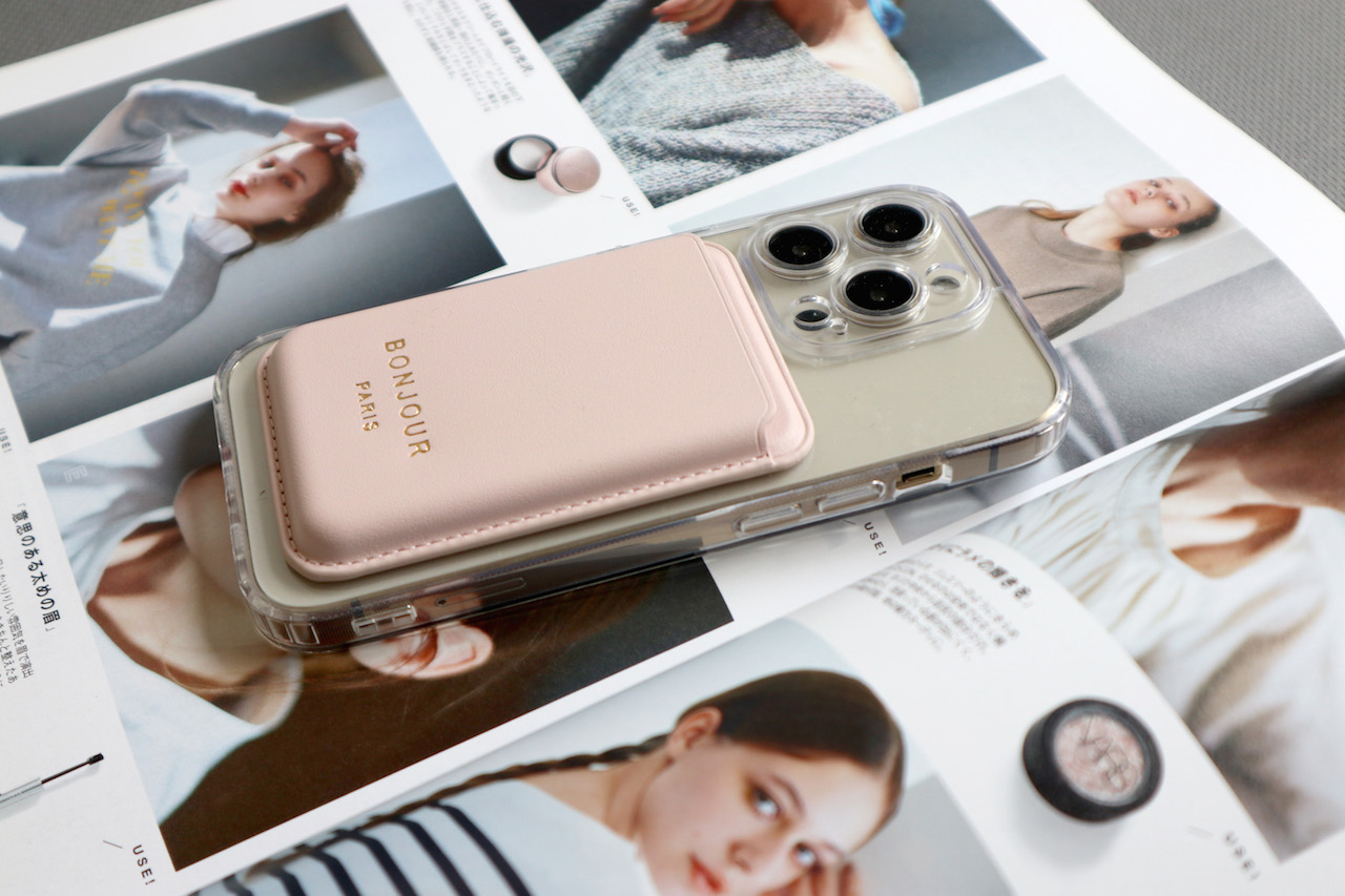 手機殼材質為透明磁吸材質 加上粉色磁吸卡夾
