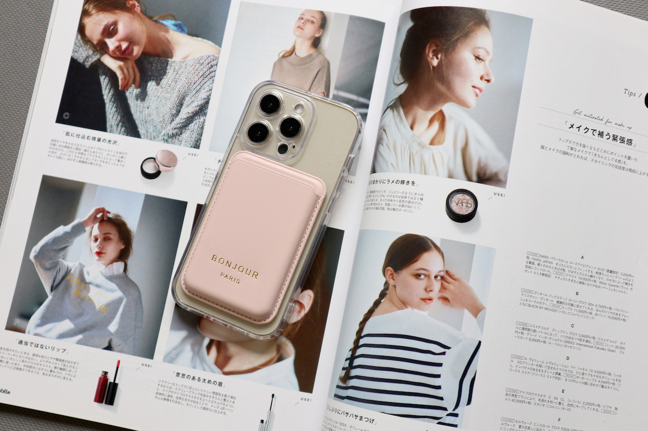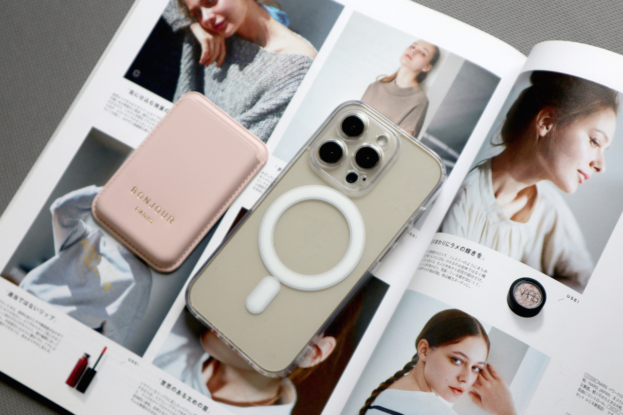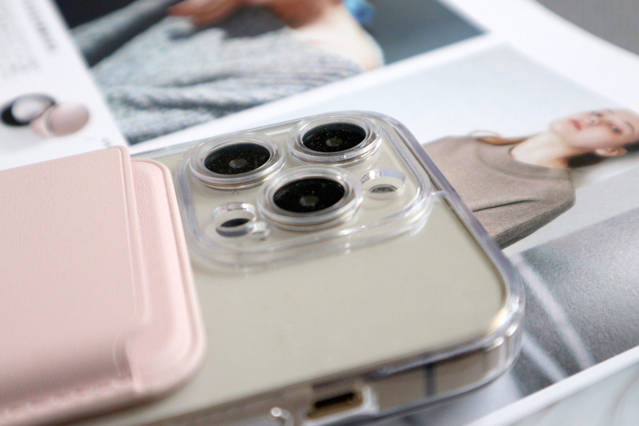 手機殼材質為透明磁吸材質 加上粉色磁吸卡夾