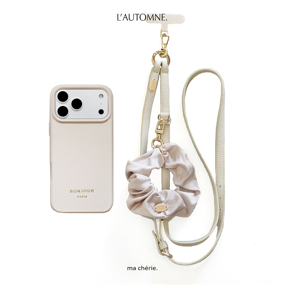 巴黎甜甜圈米白皮革斜背掛繩手機殼